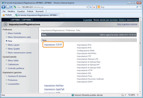 Nell'IU Remota è possibile specificare le impostazioni accedendo alla stampante in rete da un browser.