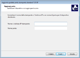 Il valore immesso in [Nome o indirizzo IP stampante] nella schermata seguente visualizzata nel processo di configurazione porta varia in base al metodo di impostazione dell'indirizzo IP della stampante.