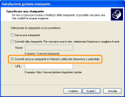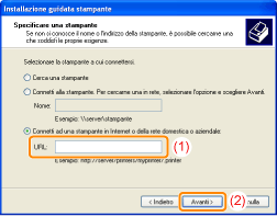 Inserire "http://<indirizzo IP o FQDN della stampante>/ipp".