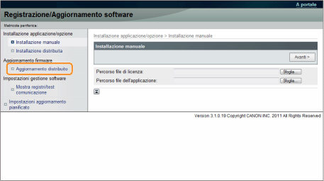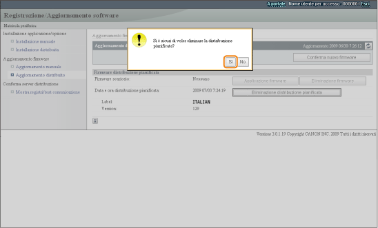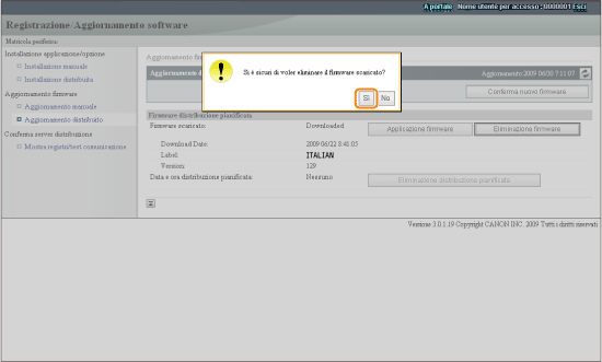 Il firmware viene applicato dopo il download dal server di consegna. Una volta completata l'applicazione, la stampante viene riavviata automaticamente. ![]() Quando il pianificazione distribuzione è impostato a [Distribuzione adesso] e tipo di distribuzione sono impostati a [Manuale]