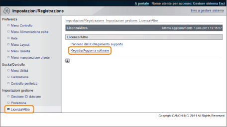 Tempo stimato necessario per applicare il firmwareIl tempo necessario per applicare il firmware scaricato è di circa 20 minuti. L'operazione potrebbe richiedere più tempo in relazione alla configurazione del sistema e all'ambiente di rete della stampante.