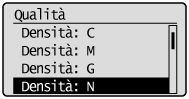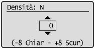Per regolare la densità del tonerRegolando la densità del toner poco alla volta, stampare i dati che risultavano difettosi dal computer, quindi controllare il risultato della stampa. Se non si riesce regolare la densità del toner, reimpostare la densità al valore predefinito "0", quindi contattare il rivenditore autorizzato Canon locale.