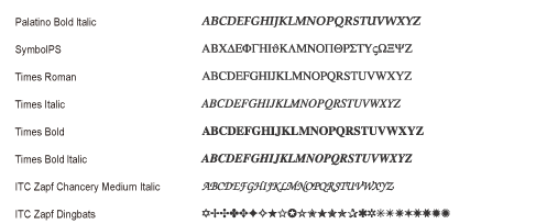 Gli elenchi di caratteri (font) stampati dal [Menu Utilità] sono un elenco completo di tutti i caratteri correntemente disponibili. L'elenco contiene i nomi e i campioni di stampa dei caratteri memorizzati nella stampante.