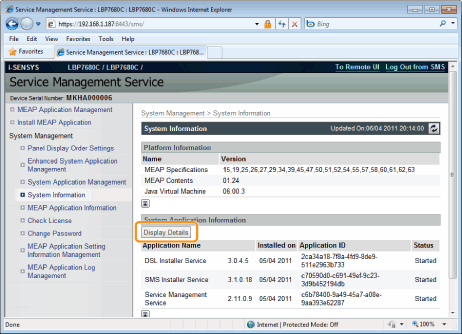 È possibile verificare le informazioni sulla versione di piattaforme come la Java virtual machine e le informazioni sulla versione, la data di installazione e lo stato delle applicazioni di sistema.