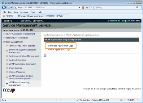 Fare clic su [MEAP Application Log Management].