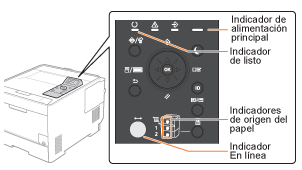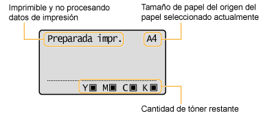 (En línea) (verde) y el indicador de origen del papel (verde) se iluminarán, aparecerá <Preparada impr.> en la pantalla y la impresora estará lista para imprimir.