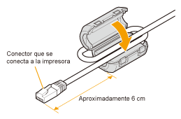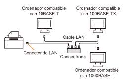 Para la LAN utilice cable de par trenzado de Categoría 5 u otra superior. Si desea conectar la impresora a una red Ethernet 100BASE-TX o 1000BASE-T, todos los dispositivos que se conecten a la LAN (concentrador, cable LAN y tarjeta de red para ordenador) deben ser compatibles con 100BASE-TX o 1000BASE-T.