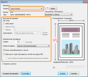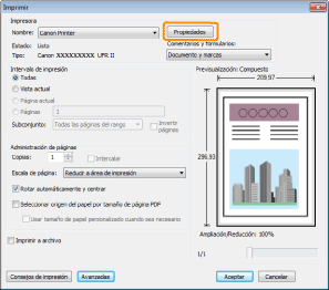 Si los valores de [Tamaño de página] y de [Tamaño de salida] son diferentesLa impresión se reducirá o ampliará automáticamente para ajustarse a la página.