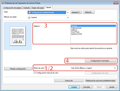 Para conocer las instrucciones acerca de cómo mostrar la pantalla del controlador de impresora, consulte "Impresión con el controlador de impresora" o "Configuración de las opciones de impresión de antemano".