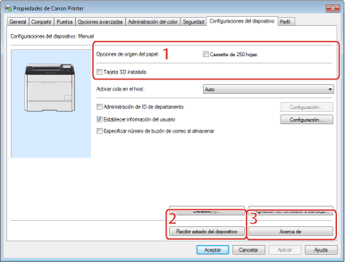 Podrá obtener información sobre el dispositivo y actualizar la configuración que aparece en la ficha (consulte "Configuración de las opciones de impresora").