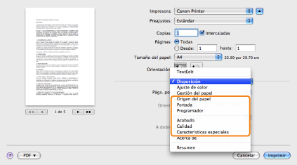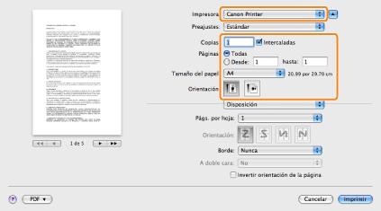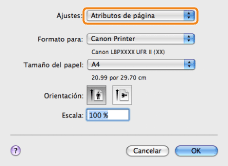 En Mac OS X 10.5.x, el cuadro de diálogo [Ajustar página] podría no mostrarse, dependiendo la aplicación utilizada. En este caso, podrá especificar el tamaño de página, la orientación de página y la escala en el cuadro de diálogo [Imprimir].