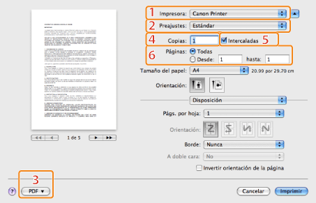 Selecciona la impresora que se utilizará entre las que se hayan añadido previamente al panel [Impresión] del cuadro de diálogo [Impresión y Fax] en [Preferencias del Sistema].