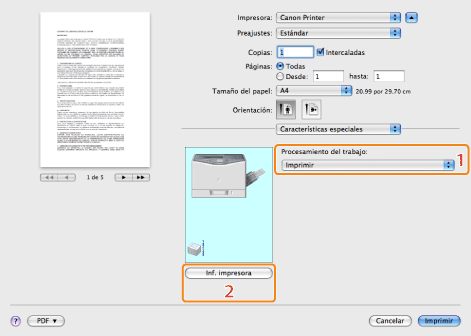Le permite cambiar el método de salida para que se guarden los datos imprimidos en un buzón de correo de la memoria de la impresora, etc.