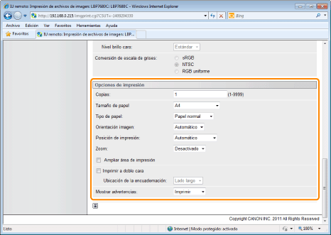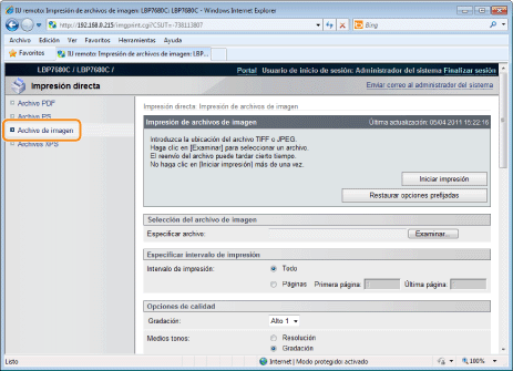 Establezca la ubicación de las imágenes de [Automático], [Centrar] o [Superior izquierda]. Cuando se seleccione [Automático], si la ubicación de impresión se especifica en los datos de formato TIFF, se imprimirá en la ubicación especificada. Si no se establece la ubicación de impresión, se imprimirá centrada. Dado que no se especifica la ubicación de impresión en el formato JPEG, si se selecciona [Automático], se imprimirá centrada.