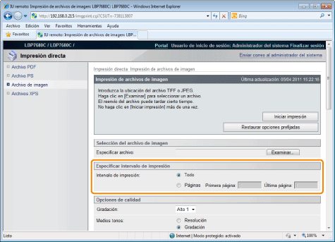 Seleccione [Páginas] e introduzca el número de página inicial y el número de página final si desea especificar el rango de impresión.