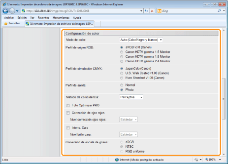 Puede seleccionar un perfil RGB que es conveniente para las características del monitor que utiliza. Establézcalo cuando imprime imágenes dibujadas con un modelo de color RGB o documentos que contienen imágenes.