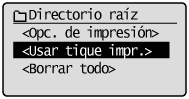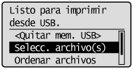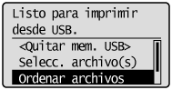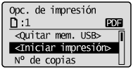Para visualizar automáticamente la pantalla en modo de impresión directa USBCuando la configuración [Mostrar automáticamente pantalla de impresión directa USB] es verificada sobre [Impresión directa USB] en el [Opciones de impresión directa USB] de la IU remota, aparece automáticamente la "pantalla de modo de impresión directa USB" cuando se inserta el dispositivo de memoria USB.