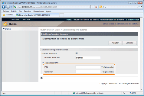 En [PIN] y [Confirmar], puede escribir el número de 1 a 7 dígitos salvo para "0".