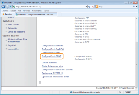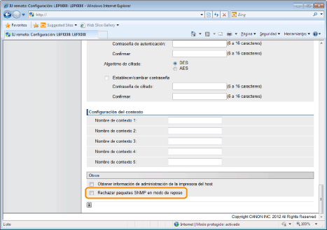 Defina una configuración para rechazar la recepción de paquetes SNMP durante el modo de reposo, según sea necesario. Si marca la casilla de verificación [Rechazar paquetes SNMP en modo de reposo], podría quedar inhabilitado el acceso a la impresora desde aquellas aplicaciones o software de Canon (Serie iW) que utilicen el protocolo SNMP.