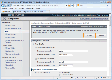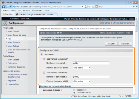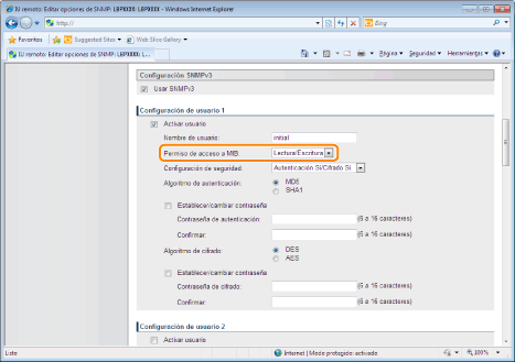 Al utilizar [Permiso de acceso a MIB], seleccione si hacer funcionar el agente SNMP v. 1 en uno de los modos [Lectura/Escritura] o [Sólo lectura].