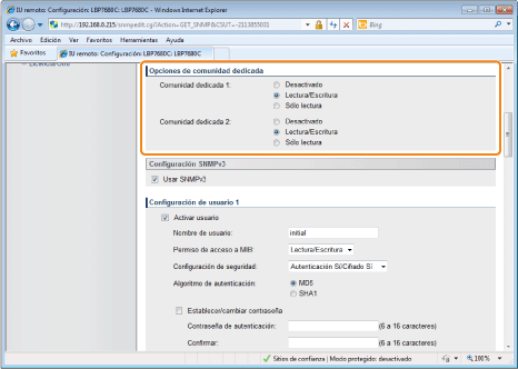 En la configuración [Comunidad dedicada 1], seleccione de [Desactivado], [Lectura/Escritura] o [Sólo lectura].