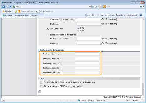 Escriba los nombres del contexto utilizados por el protocolo SNMP v. 3 en [Nombre de contexto 1] a [Nombre de contexto 5] bajo [Configuración del contexto]. Se puede escribir hasta 32 caracteres.