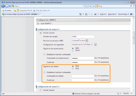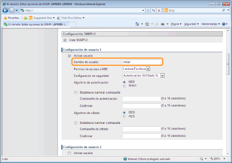 Cuando configura la información del usuario para el protocolo SNMP v. 3, establezca la información del usuario utilizando [Configuración de usuario 1] para [Configuración de usuario 5].
