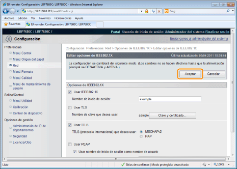 La configuración entrará en vigor tras ejecutar un reinicio por hardware o al reiniciar la impresora.