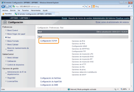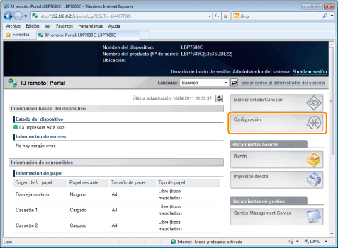 En la IU remota, podrá especificar la configuración accediendo a la impresora desde su navegador Web a través de la red.