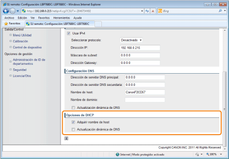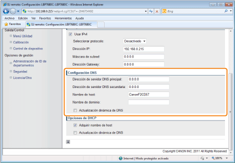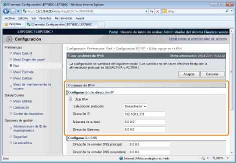 Si desea configurar opciones como, por ejemplo, los ajustes del servidor DNS, utilice la IU remota o FTP Cliente.