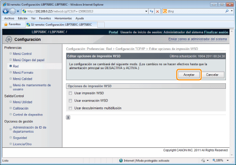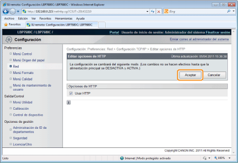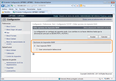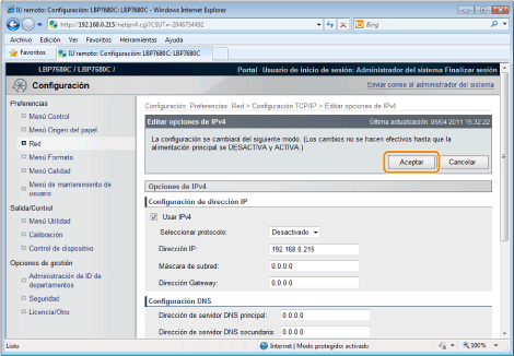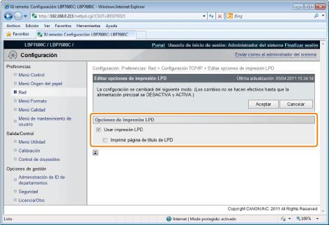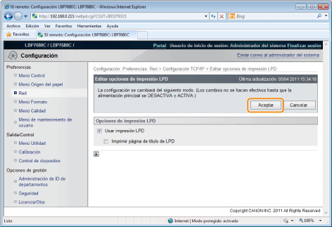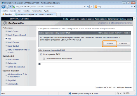 La configuración entrará en vigor tras ejecutar un reinicio por hardware o reiniciar la impresora.