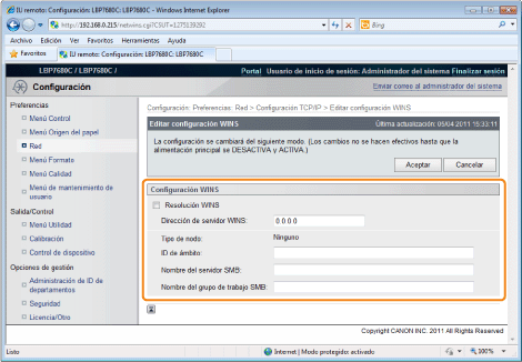 ![]() ![]() Cuando utiliza la resolución WINSSeleccione la casilla de verificación [Resolución WINS], y establezca los siguientes elementos.