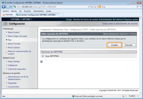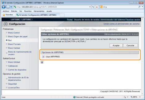 Cuando borra la casilla de verificación [Usar ARP/PING]No podrá configurar la dirección IP utilizando el comando ARP/PING.