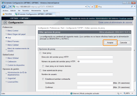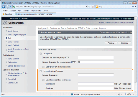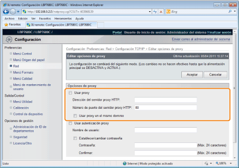 ![]() ![]() Cuando utiliza unas funciones de proxySeleccione la casilla de verificación [Usar proxy], y establezca los siguientes elementos.