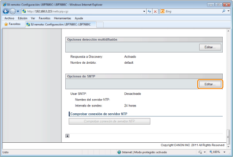 Haga clic en [Editar...] en [Opciones de SNTP].