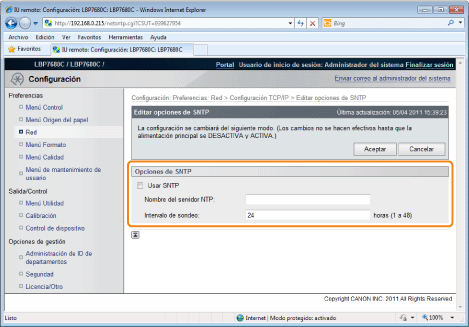![]() ![]() Cuando utilice la función SNTP cliente para obtener la información del tiempo desde el servidor NTPSeleccione la casilla de verificación [Usar SNTP], y establezca los siguientes elementos.