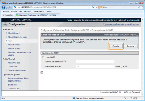 ![]() Cuando no utilizar la función SNTP ClienteQuite la casilla de verificación [Usar SNTP].