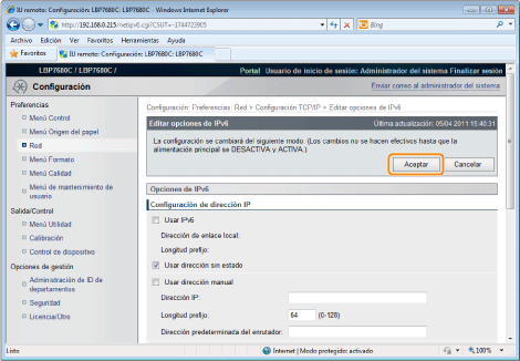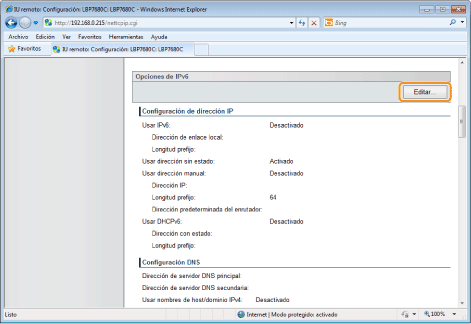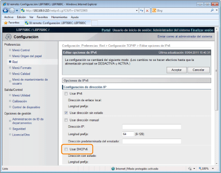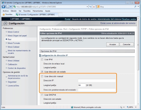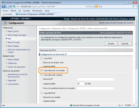 Retención de la dirección sin estadoDespués la casilla de verificación [Usar dirección sin estado] se selecciona y la impresora se reinicia, la dirección sin estado aparece automáticamente. Esta dirección sin estado se descarta cuando la impresora se apaga.