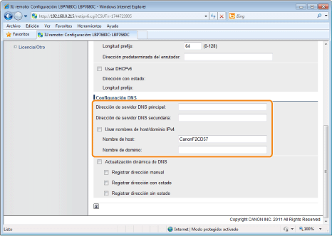 Cuando utiliza un nombre de host y un nombre de dominio que son diferentes desde IP v. 4, escriba [Nombre de host] y [Nombre de dominio]. Puede escribir hasta 47 caracteres.