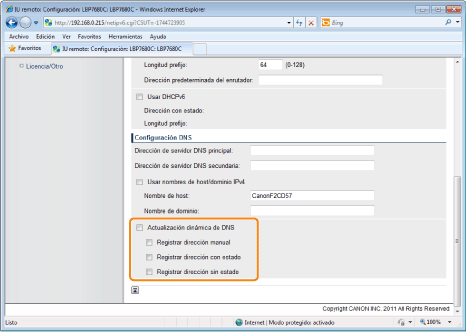 Actualización dinámica de DNSLa actualización dinámica de DNS es una función que añade la dirección IP del dispositivo y los nombres especificados como nombre de host y nombre de dominio al servidor DNS automáticamente.