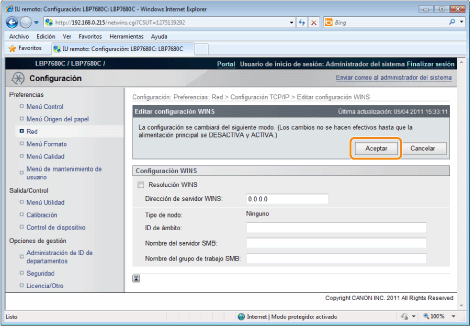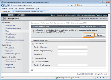 La configuración entrará en vigor tras ejecutar un reinicio por hardware o al reiniciar la impresora.
