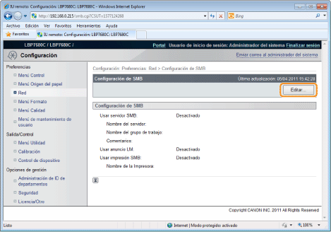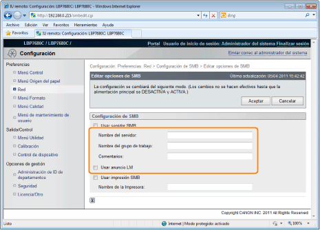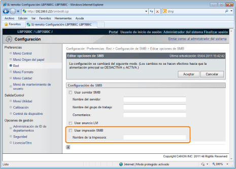 Acerca de la impresión SMBPodrá utilizar la impresión SMB sólo cuando está instalada una tarjeta SD.