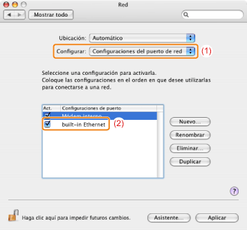 Si [built-in Ethernet] no aparece en [Configurar]Seleccione [Configuraciones del puerto de red] y marque la casilla de verificación [built-in Ethernet].