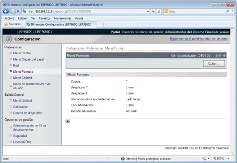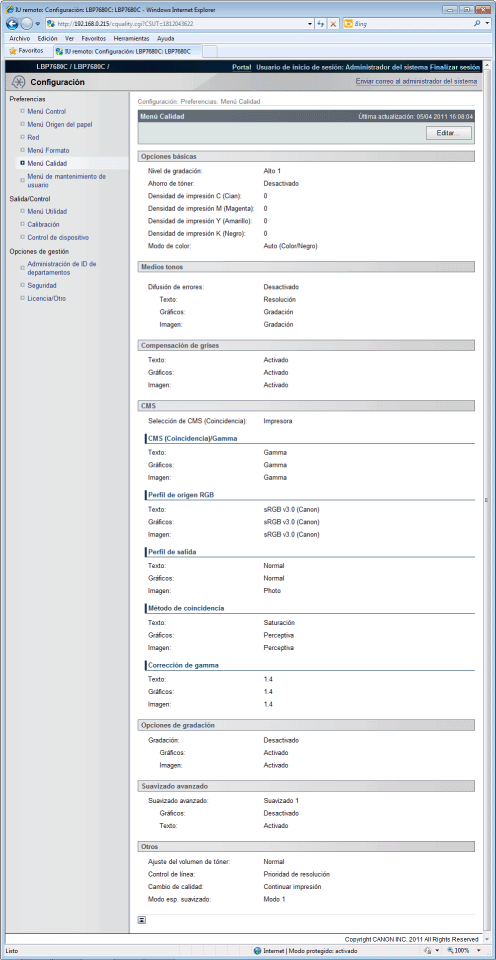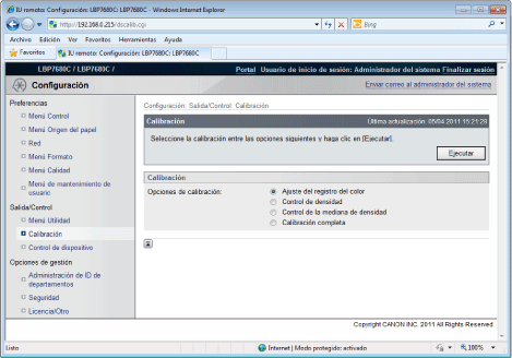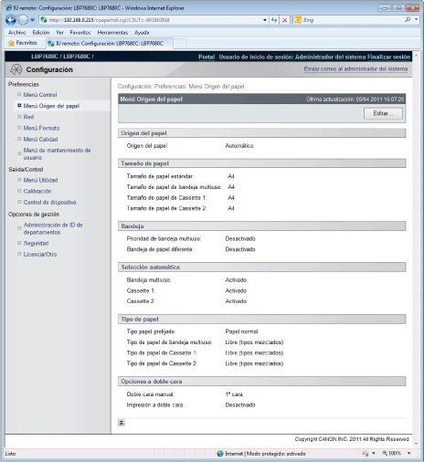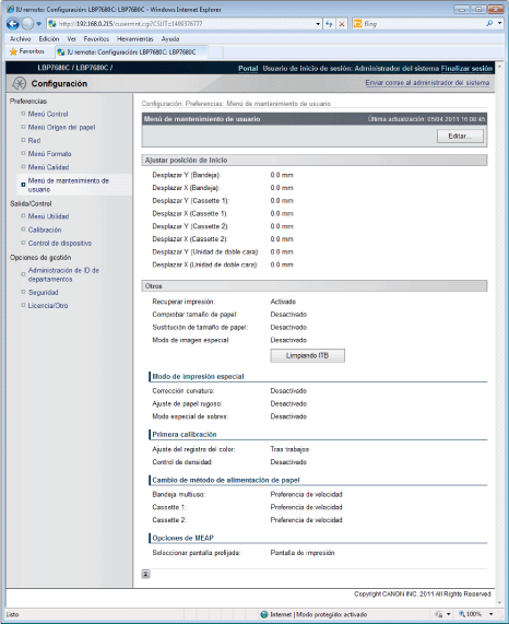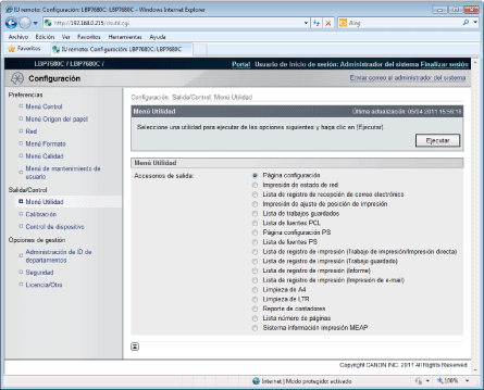 [Configuración]Puede establecer/cambiar las diversas configuraciones de la impresora. Los elementos que se pueden establecer/cambiar varían según inicie una sesión como administrador o usuario final.