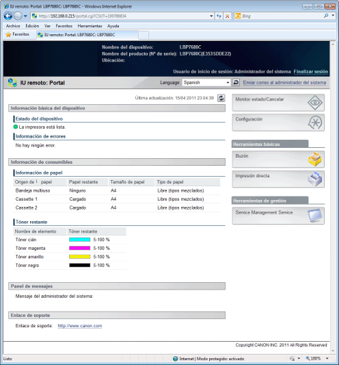 [Servicio de administración de servicios] (sólo LBP7680Cx)Muestra la pantalla SMS (Servicio de administración de servicios).