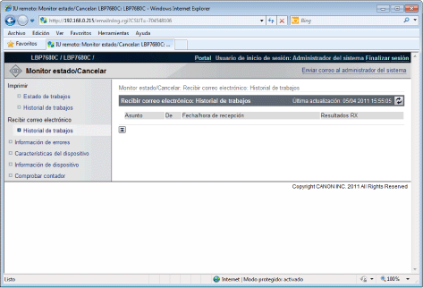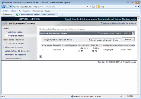 Visualización de la página [Historial de trabajos]Sólo será posible visualizar el historial de tareas cuando la visualización del historial de tareas esté permitida por [Visualizar registro de trabajos] de [Configuración] – [Opciones de gestión] – [Seguridad].