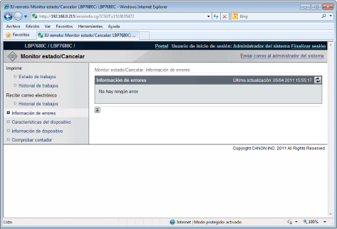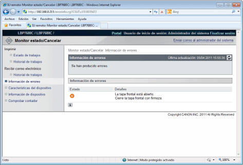 [Información de errores] (Información)Aparece el estado y las soluciones para la información del error ocurrido en la impresora.
