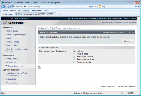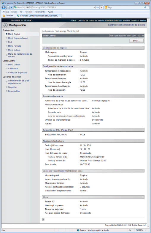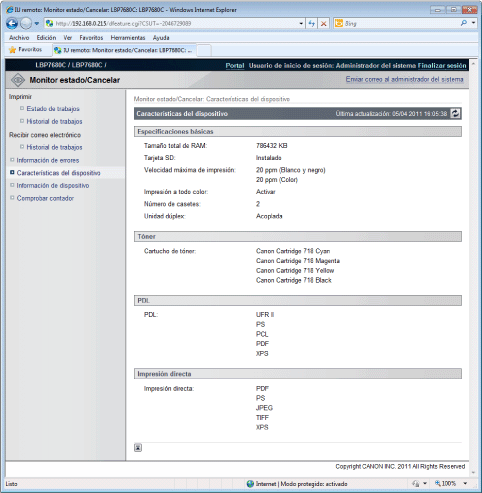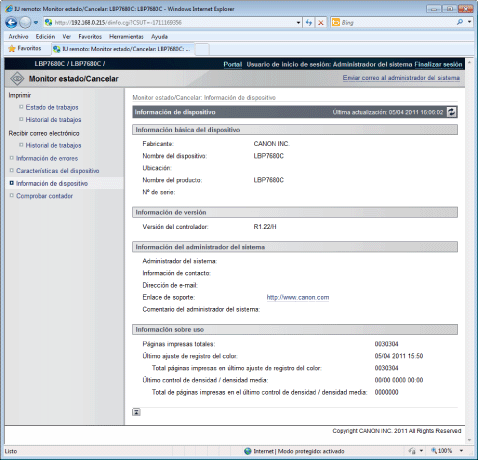 [Información básica del dispositivo]Muestra la información básica acerca de la impresora.