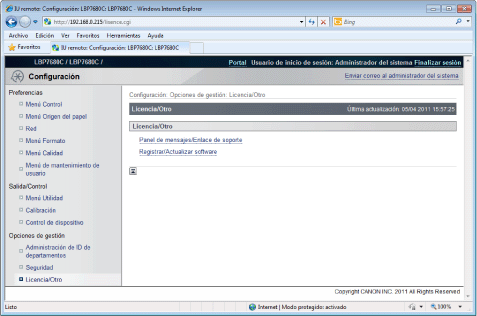 [Registrar/Actualizar software]Muestra las páginas para las que se efectúa el registro o la actualización de software.