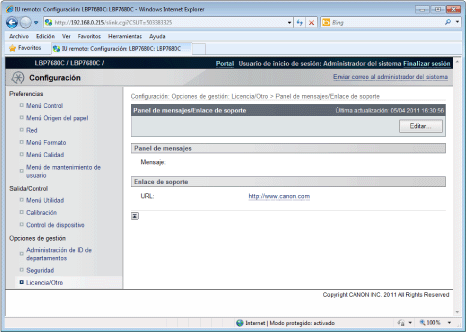 [Panel de mensajes/Enlace de soporte]Muestra mensajes del administrador y los enlaces a las páginas de soporte.